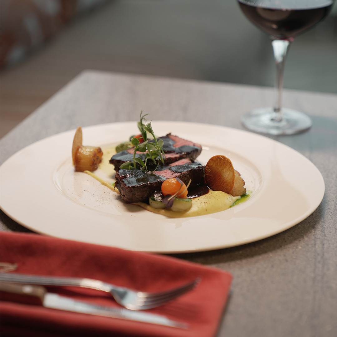 Fransız usulü patates püresi, tane karabiber ile tatlandırılmış dana bonfile, derin yağda kızartılmış bostan patlıcan, siyah patlıcan ezmesi, taze kuşkonmaz, sote edilmiş baby havuç ve sakız kabağı, taze kişniş yağı, pepper sos